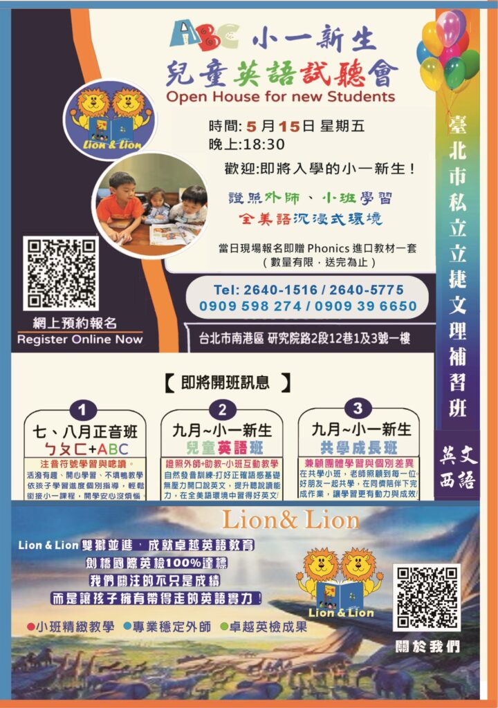 Since 2007, Lion and Lion Language Institute has been excited to provide quality education at every level. Our professionalism in foreign languages and vast teaching experience in Taiwan has led us to grow over the past 14 years. We would like to invite you to know us more!
